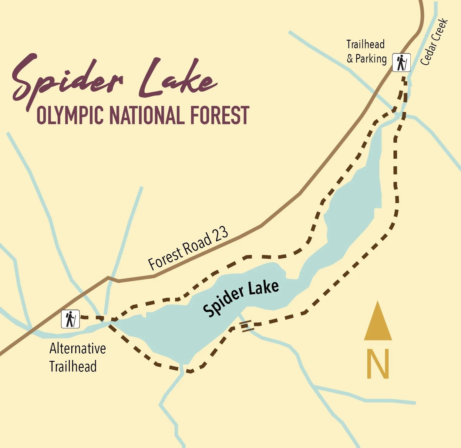 A long slender lake tucked within a narrow valley on the Skokomish–Satsop River divide, Spider is graced with groves of ancient giant old-growth forest. The trail around the lake is a remnant of a longer trail that once traversed miles of primeval trees. Most of those trees have since been logged, and the trail truncated to the lake. The remaining trail has since been restored and the forests on the surrounding hillsides are regenerating nicely.