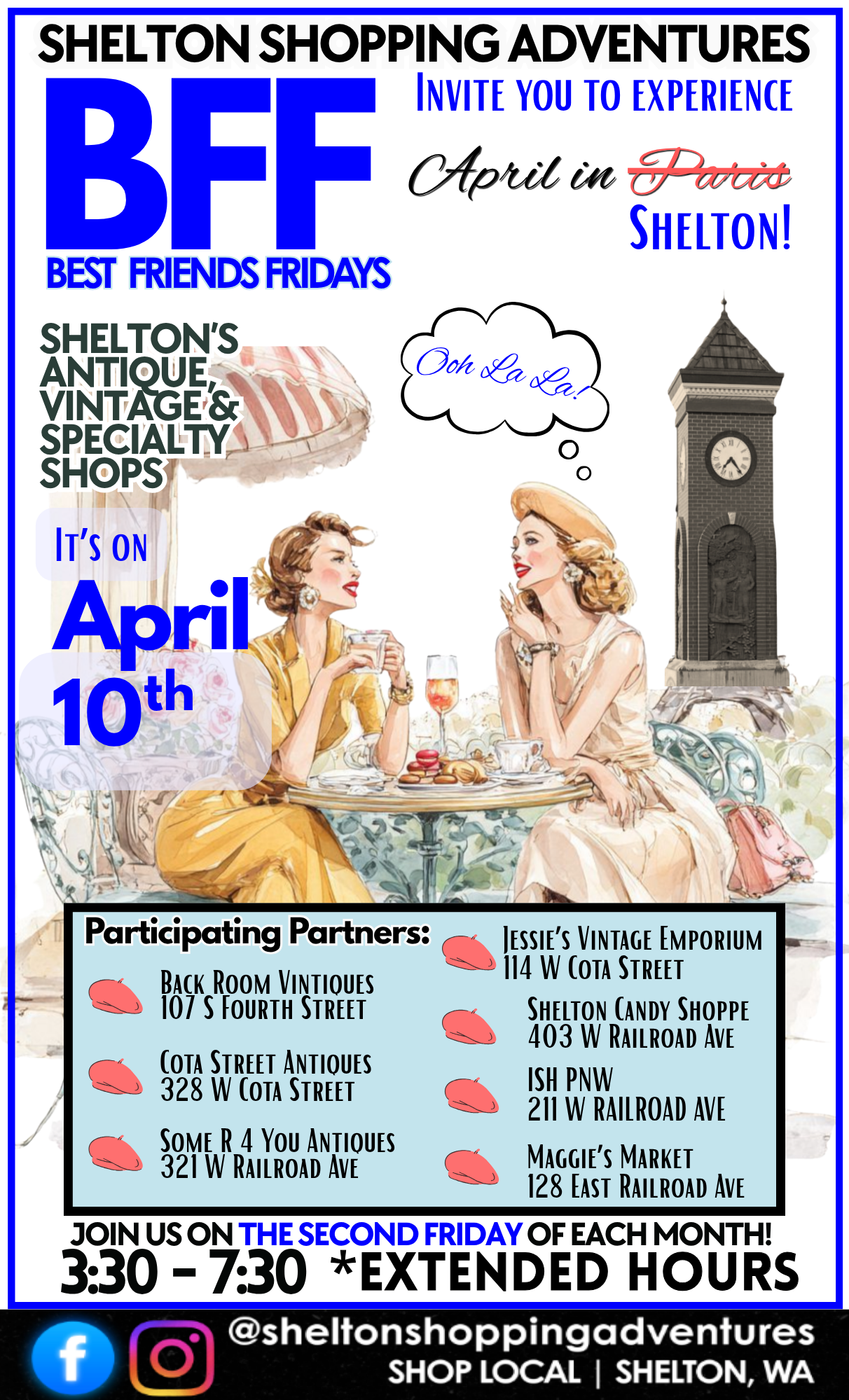 Join Shelton’s antique, vintage & specialty shops for extended hours every second Friday of the month! Stroll through downtown Shelton and discover unique finds at participating shops from 3:30–7:30 PM.